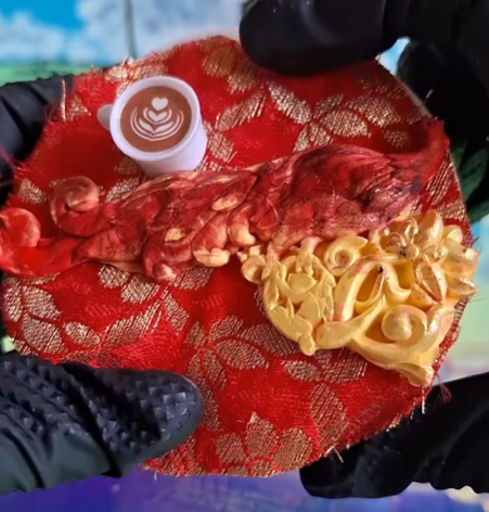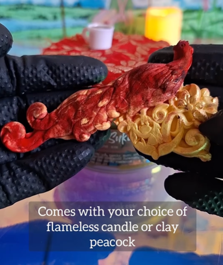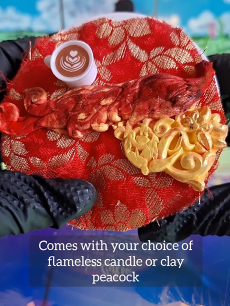 Notes: Each slime comes with red foil leaf, which you may add for decorative accents, & also comes with a red & gold embroidered mini decorative “rug” (make sure to put the foam barrier in between the slime & fabric before decorating; fabric sticks to slime -- see my assembly video on Instagram for a visual guide of how to assemble). Each slime will come with your choice of a flickering flameless battery-powered candle or detailed peacock clay piece that I have hand-pigmented red & gold. Each slime also comes with a cup of chai charm, and some of them come with an optional golden teapot charm.