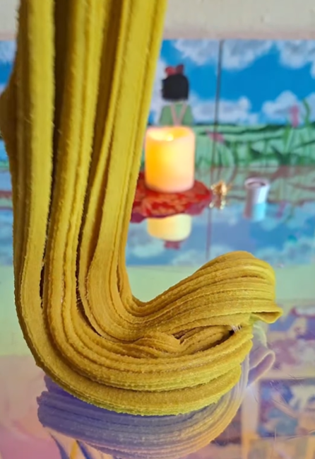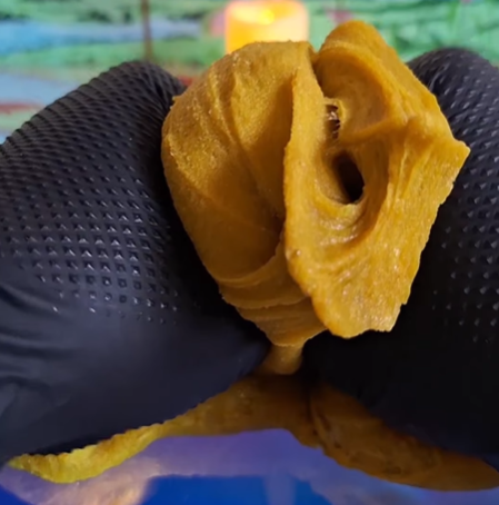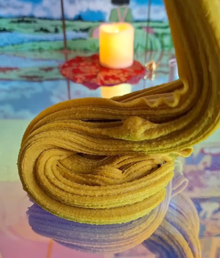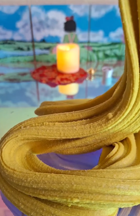 With this slime, I wanted to evoke a cozy & elegant atmosphere cultivated just to one’s tastes. This texture is rich & decadent, a velvety variant of my fan favorite foamy icee texture that reminds me of sinking into plush velvet, in a gorgeous mustard-yellow. It comes with red foil leaf which you may add for decorative accents, & comes with a red & gold embroidered mini decorative “rug” (make sure to put the foam barrier in between the slime & fabric before decorating; fabric sticks to slime). Top it off with the flickering candle, cup of chai, & golden teapot. Alternatively, instead of the candle, I will offer a select few with a peacock clay piece pigmented red & gold.