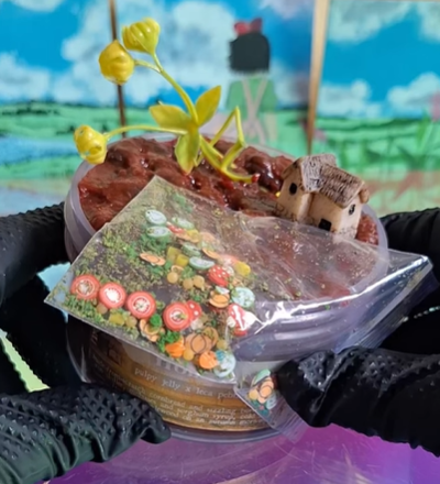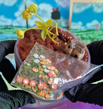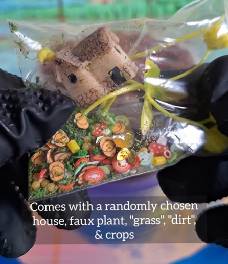 Note: Each slime comes with faux “grass & dirt”, faux plants, vegetable harvest fimos, and a tiny cottage home (various designs - randomly chosen) for you to build a realistic landscape with.