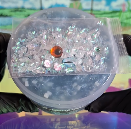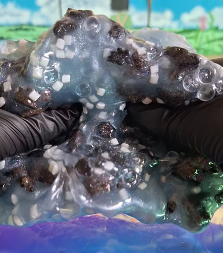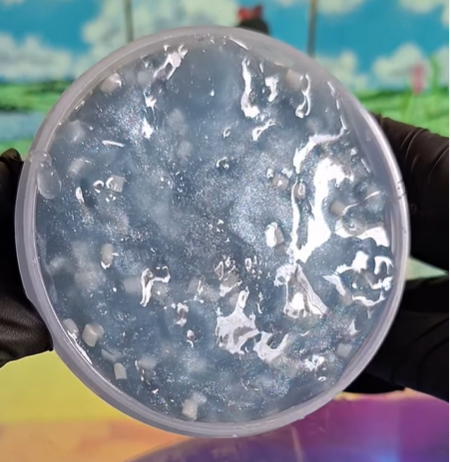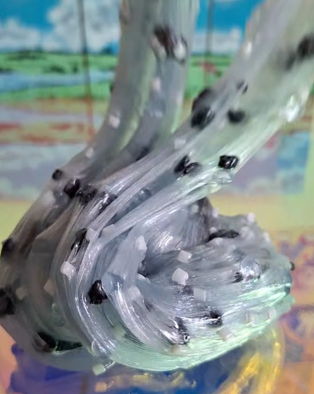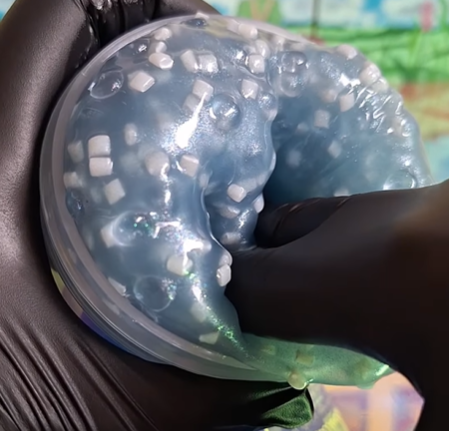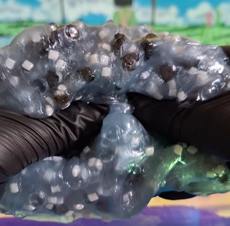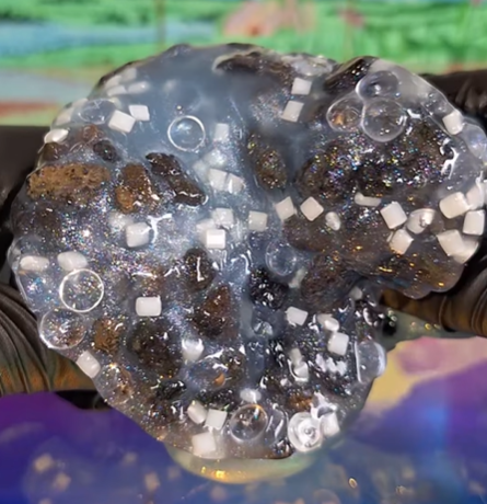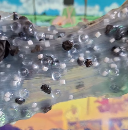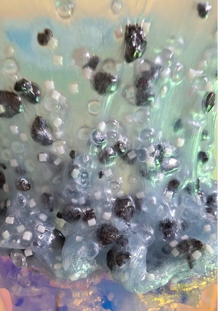 This slime is a reminder of this. Its clear base represents transparency, the willingness to see & be seen. Opaque “sugar scrub” beads remind me of teeth, suggesting ancestral presence & communication. Lava rocks, formed through intense pressure & carrying the memory of fire, represent all we carry, being fully present with collective pain. Water-droplet-like fishbowl beads speak to the various identities we carry, reflected in each other.
